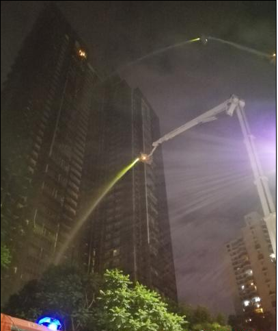 不久,現(xiàn)場消防車增至22輛、消防官兵增至110多名。兩臺消防高噴車在外圍控制了火勢蔓延。消防員攜帶救援器材,繼續(xù)徒步上樓,逐層內(nèi)攻搜索排查。至21時45分,火災(zāi)被完全撲滅。