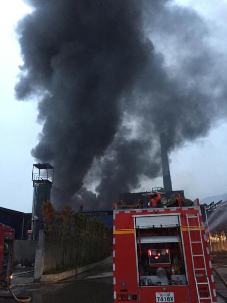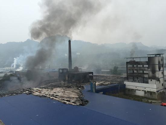 接到報(bào)警后,宜賓消防支隊(duì)下屬7個(gè)中隊(duì)、19輛各類消防車、100余名消防官兵迅速趕到現(xiàn)場(chǎng)進(jìn)行處置,同時(shí),支隊(duì)?wèi)?zhàn)勤保障大隊(duì)緊急調(diào)集4噸泡沫滅火藥劑趕赴現(xiàn)場(chǎng)。消防官兵到達(dá)現(xiàn)場(chǎng)后,經(jīng)偵查沒有發(fā)現(xiàn)無人員被困。只見現(xiàn)場(chǎng)濃煙滾滾,一棟四層建筑和旁邊兩座鋼結(jié)構(gòu)廠房起火,過火面積較大,廠房石棉瓦頂棚和內(nèi)部可燃物正在劇烈燃燒,燃燒物質(zhì)有油、P2O4有機(jī)溶劑和裝硫酸鋅的膠桶等,現(xiàn)場(chǎng)情況十分危急。