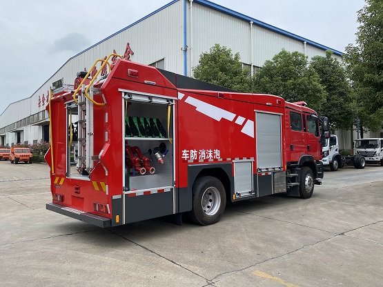 JDF5190GXFPM80/G6型泡沫消防車采用重汽汕德卡ZZ5206N471GF5底盤改裝而成。整車由消防員乘員室和車身兩大部分組成,乘員室為原裝雙排,可乘坐2+4人,該車為外露罐結(jié)構,車身前部為器材箱,中部為水罐,后部為泵房。